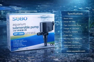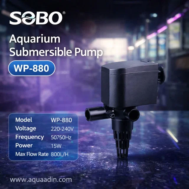 پمپ آب آکواریوم SOBO مدل WP-880 یک پمپ غرقابی (Submersible Pump) کممصرف و کاربردی برای آکواریومهای خانگی است. این پمپ قابلیت استفاده برای گردش آب، انتقال آب، راهاندازی آبشار، فیلترهای زیرشنی و کمک به اکسیژنرسانی را دارد.